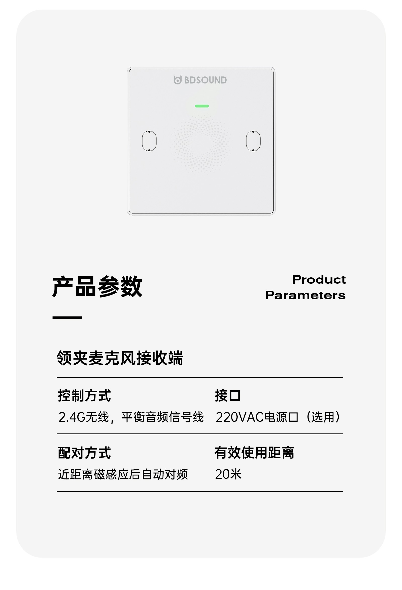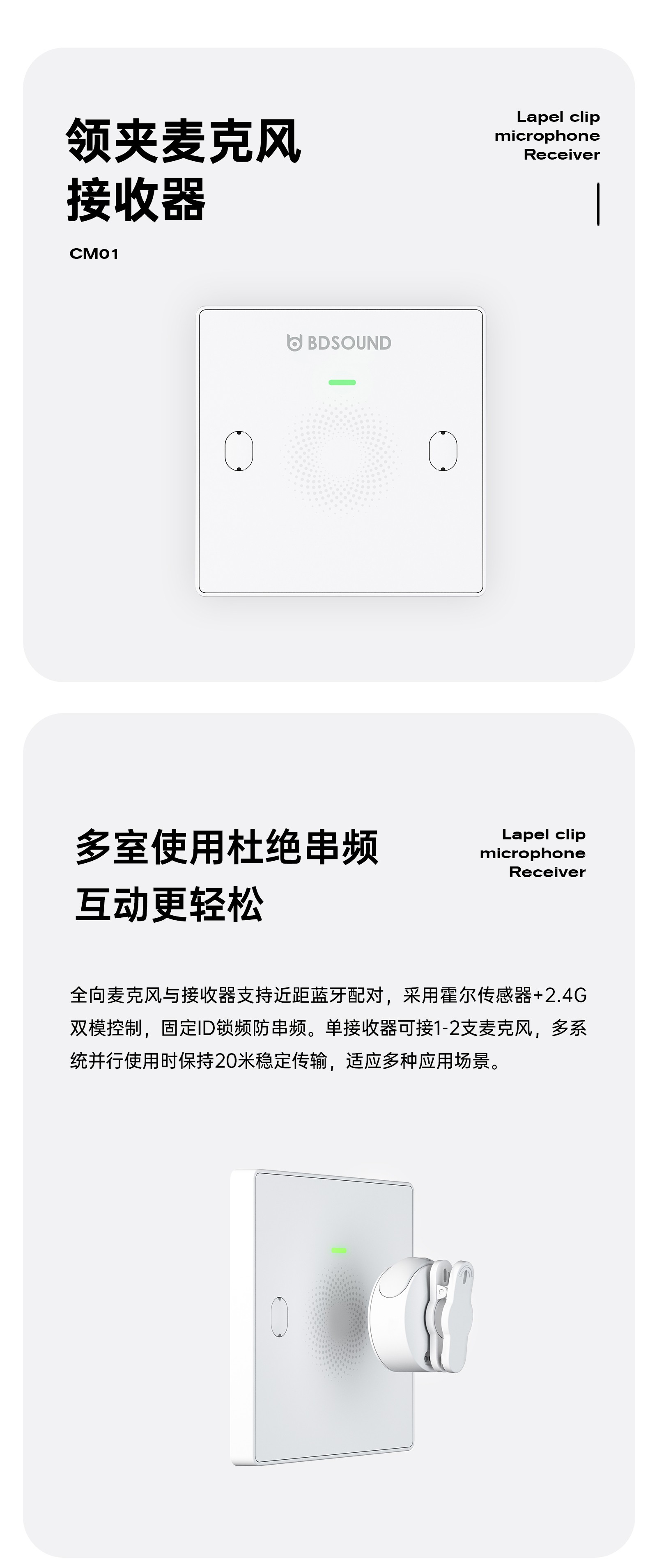 CM01接收机是一款标准86型尺寸的无线领夹接收主机,设计简洁,便于安装和更换,适用于教育装备场景。设备配备指示灯、对频感应区域、凤凰插接口(语音信号输出)及电源接口。对频操作简单快捷,只需将发射机贴近接收机中央的对频感应区域,指示灯绿色闪烁并伴有提示音,即可快速完成配对,确保稳定连接。