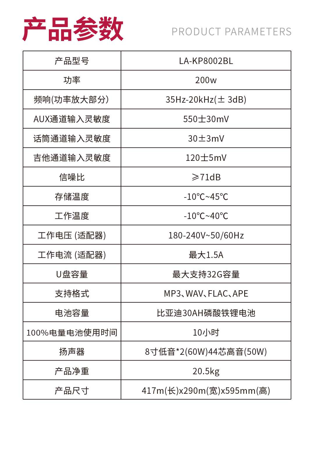 扬声器:8寸双低音*2 (60W) 44芯高音(50W)