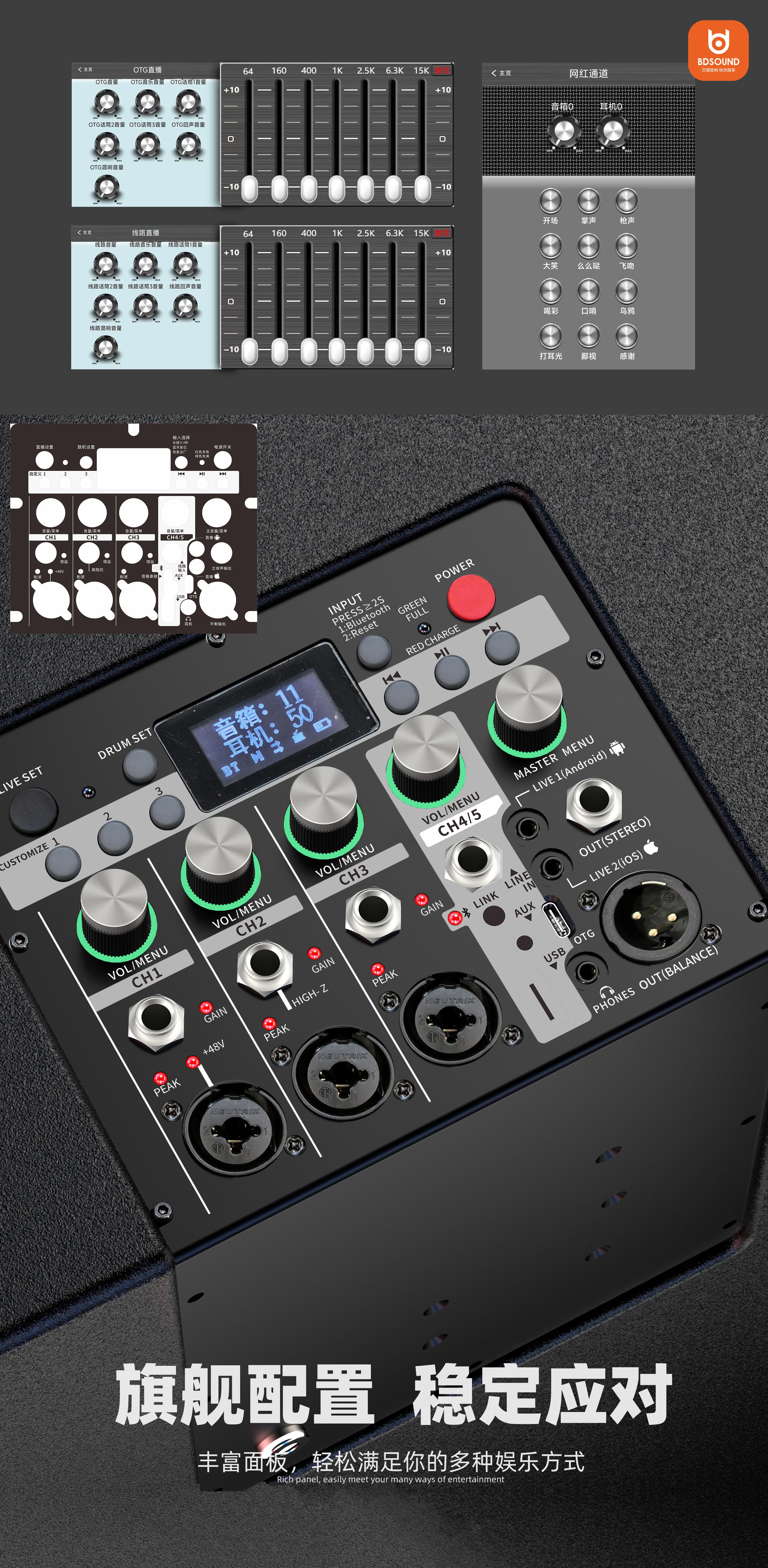 2.一路立体声线路输入口3.一路U盘接口,支持U盘内录4.两路3.5有线直播接口