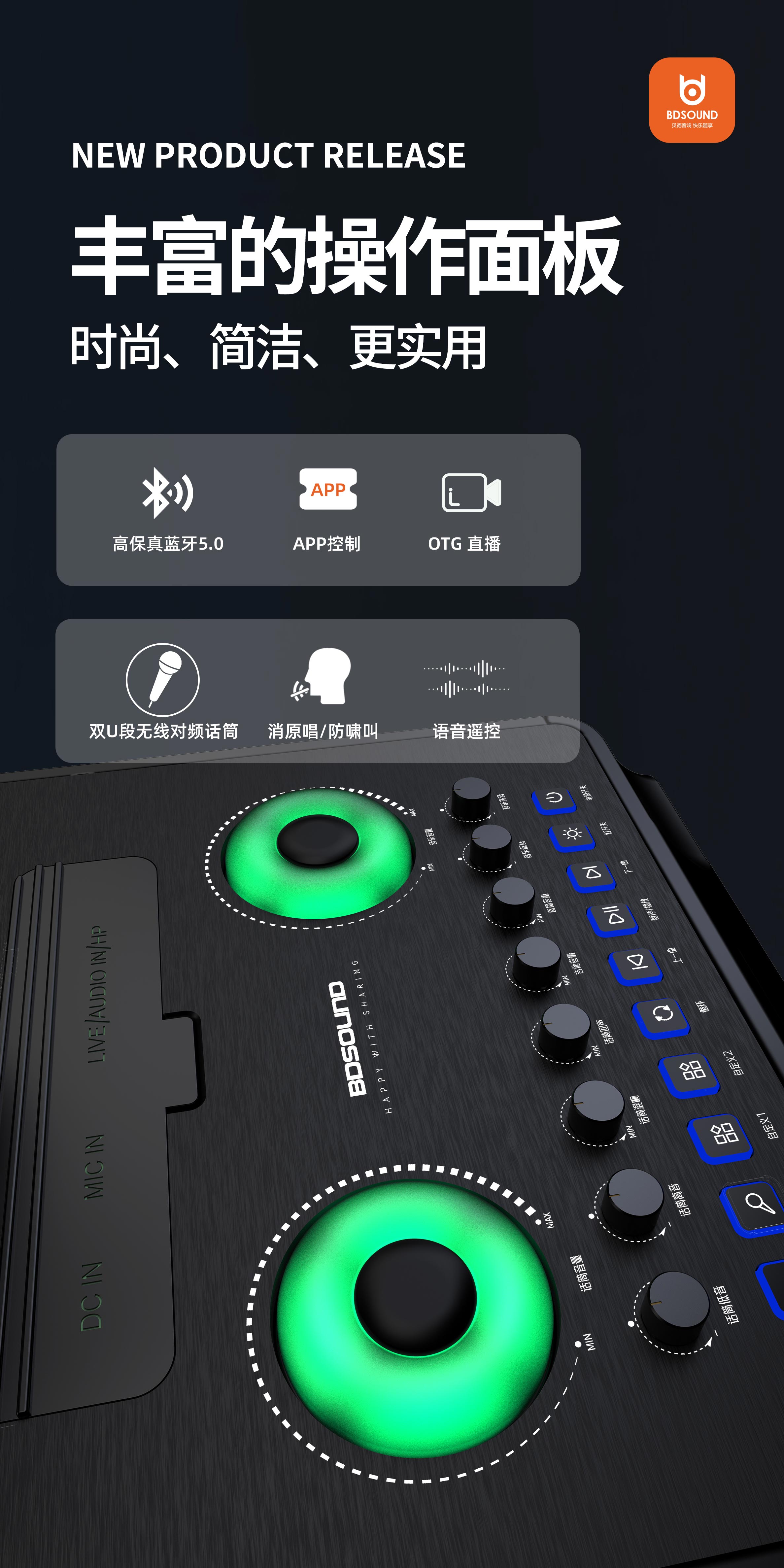 支持话筒音量、话筒高音、等独立调节;支持原唱/伴唱、话筒优先功能;支持开机或关机双模式充电功能;支持音乐各音音量独立调节;