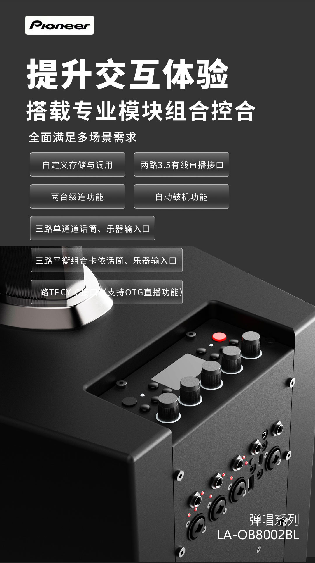 5.三路平衡组合卡依话筒、乐器输入口;